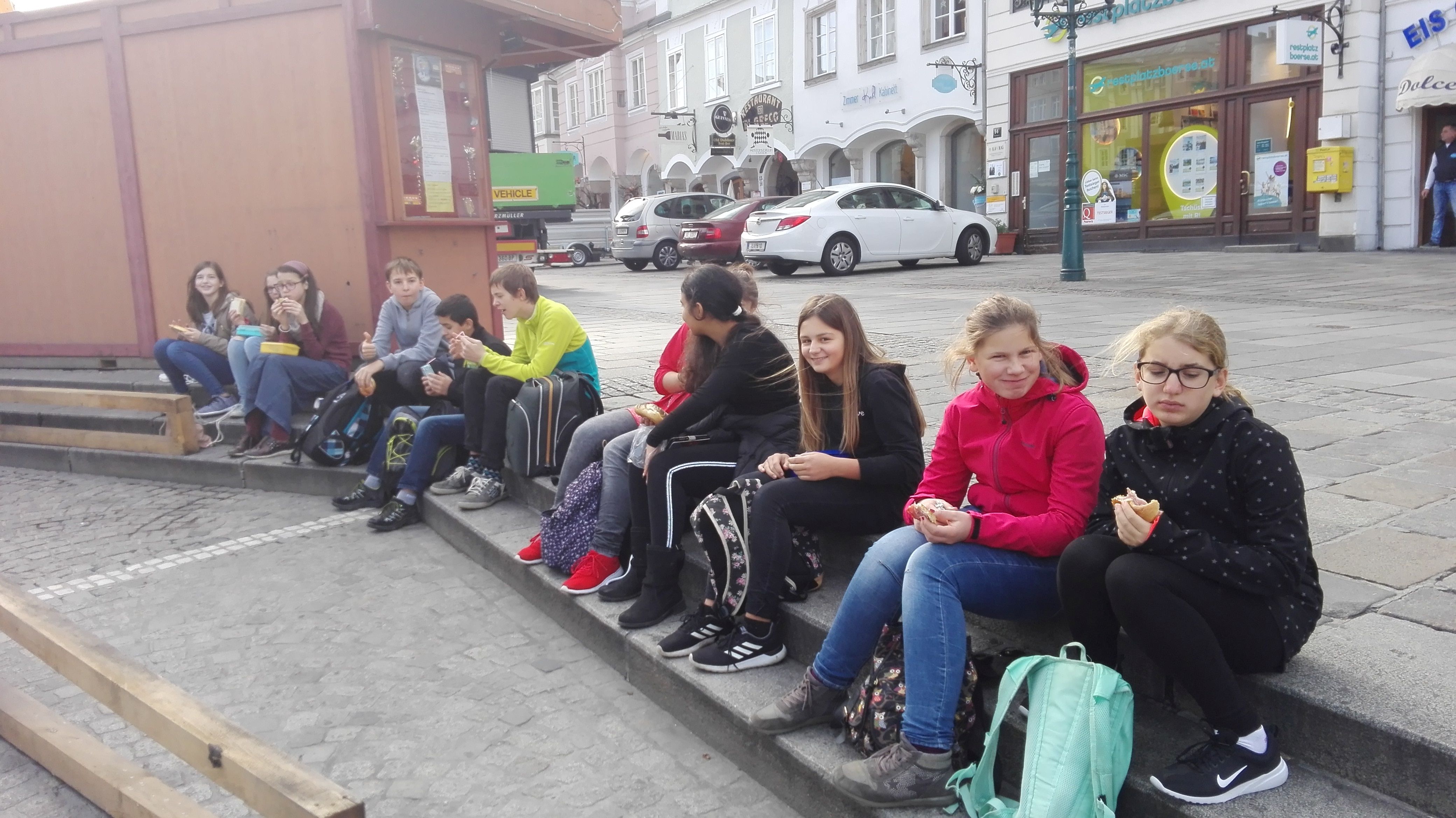 Die ARGE der Obdachlosen ist eine Organisation, die sich unter anderem für die Realisierung der Obdachlosen-Zeitung „Kupfermuckn“ verantwortlich zeichnet. Drei (ehemalige) Obdachlose führten die Schülerinnen und Schüler durch Linz und vermittelten ein „Sightseeing“ der etwas anderen Art. Sehr berührend erzählten sie den Kindern von ihren Schicksalen und zeigten ihnen zugleich, wo und welche Hilfe in der Landeshauptstadt geboten wird. Die Kinder lauschten mit großem Interesse. Ein sicherlich lehrreicher Tag für alle Teilnehmenden.