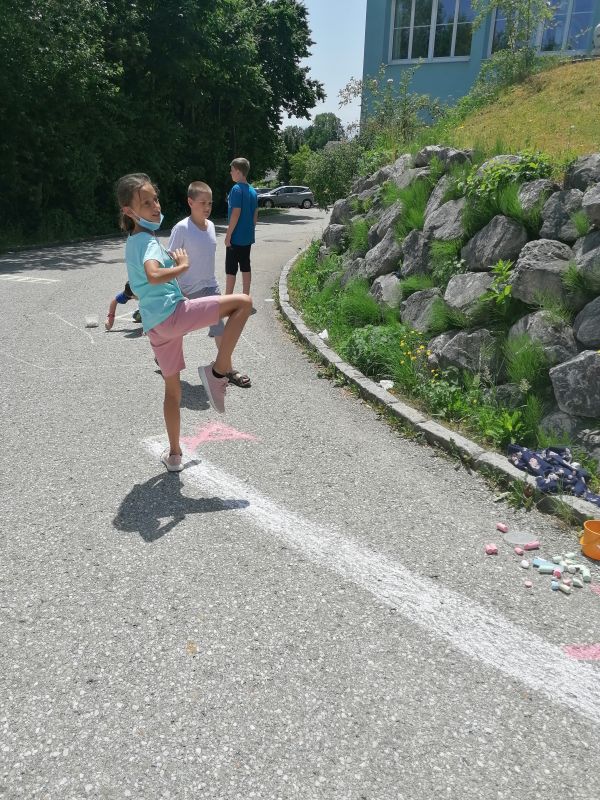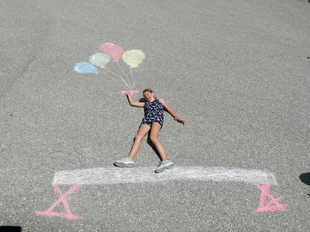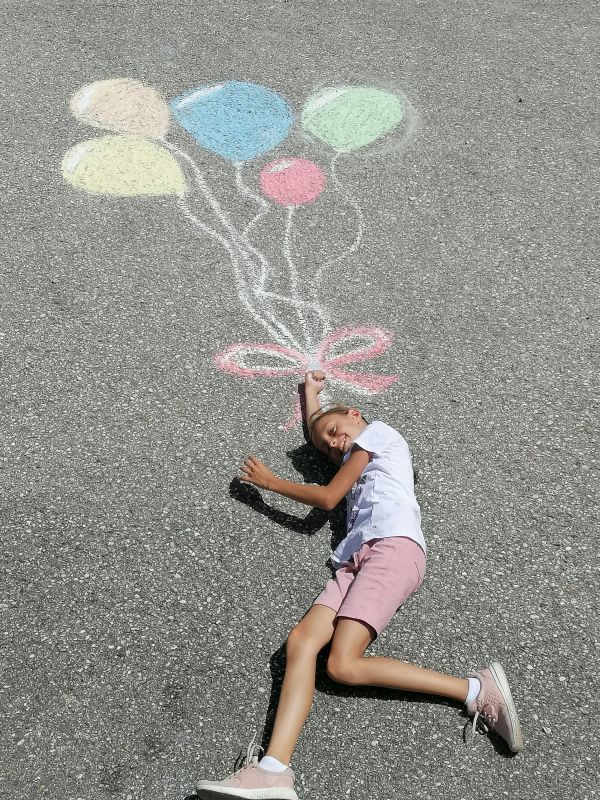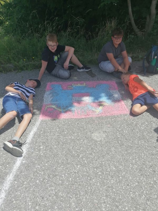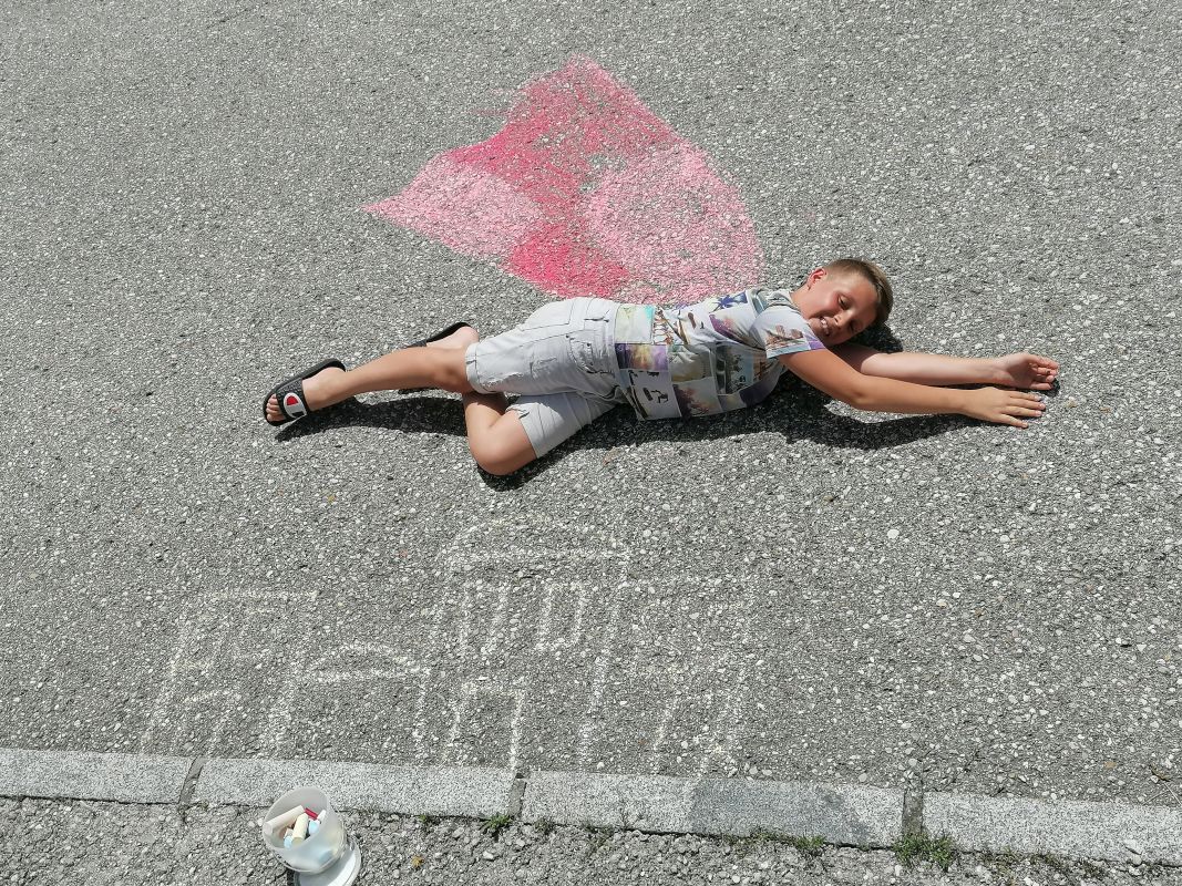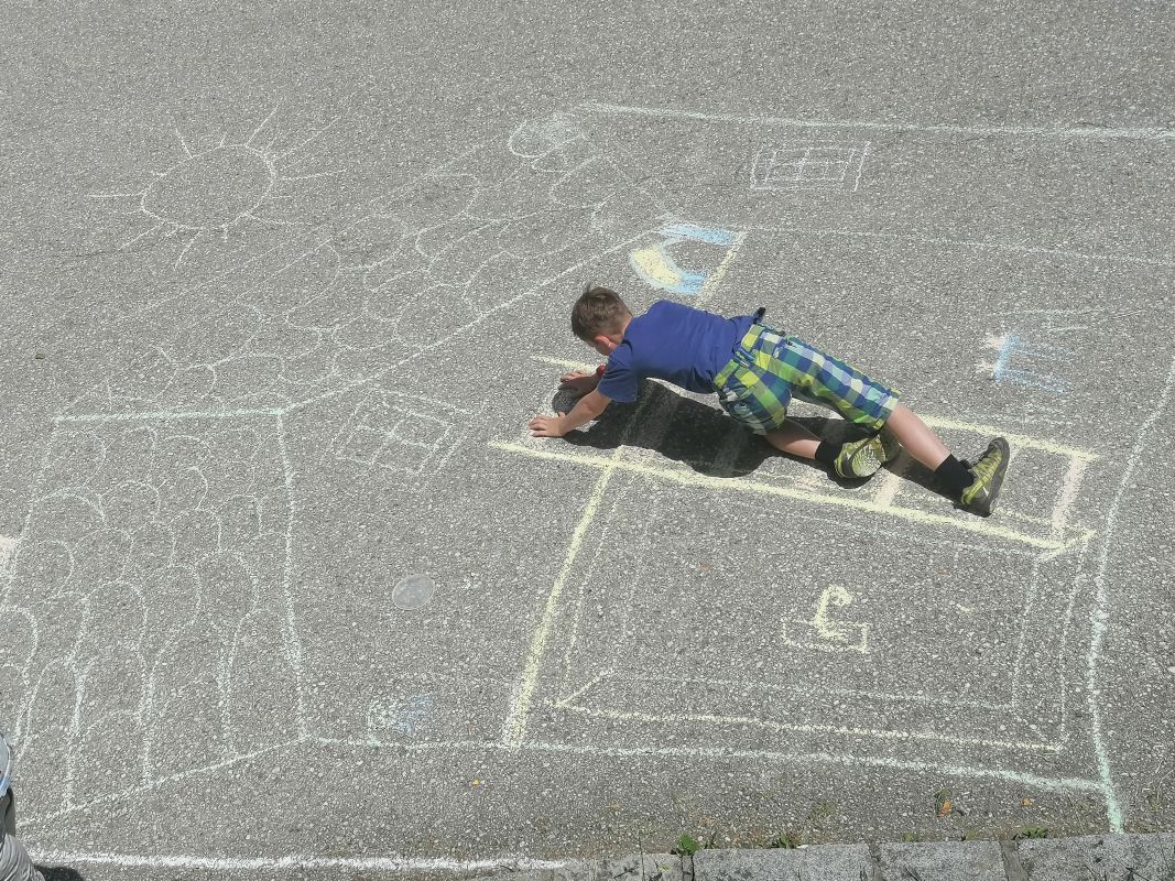 Mit Straßenkreide „bewaffnet“ ging es bei 30 Grad hinaus ins Freie. Frisch ans Werk brachte die 1b wahrlich erstaunliche Kunstwerke auf die Straße. Richtig positioniert hoben die Kinder ab, mittels Luftballons und Supermancape.