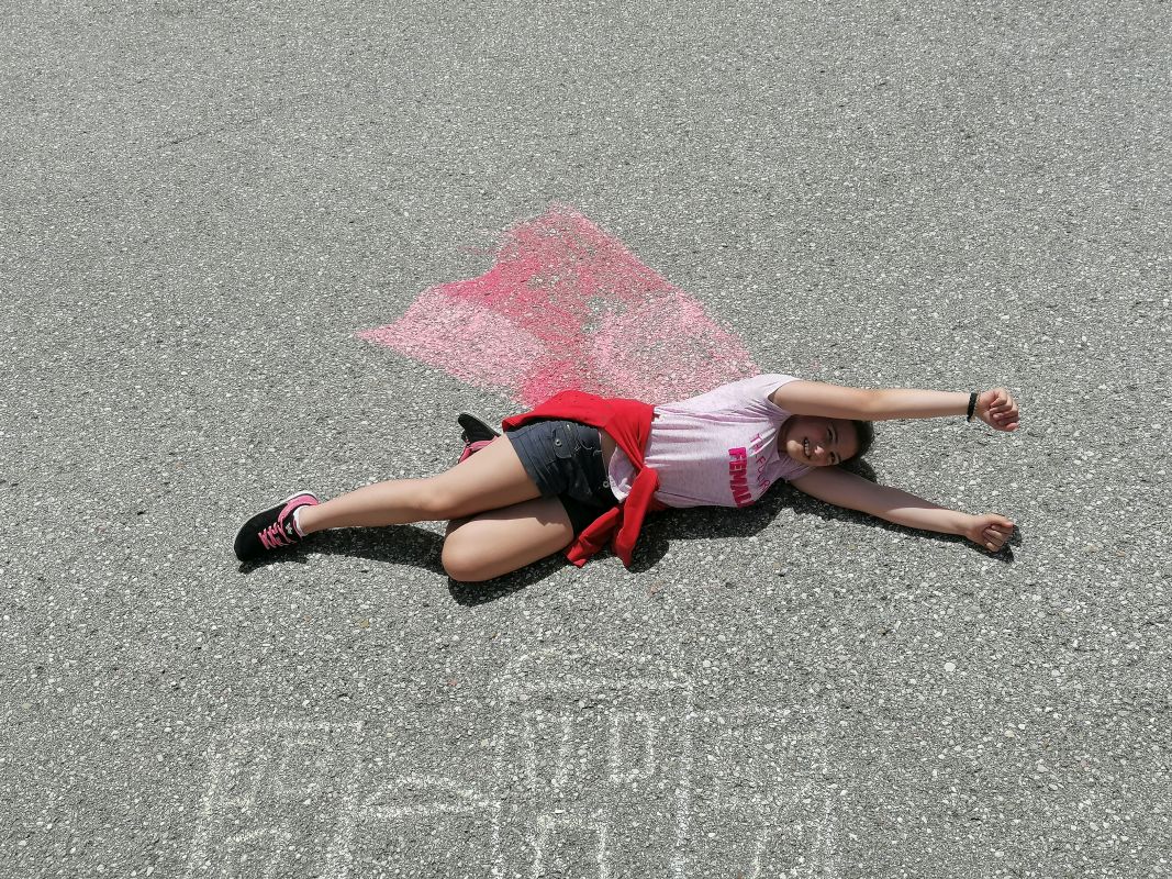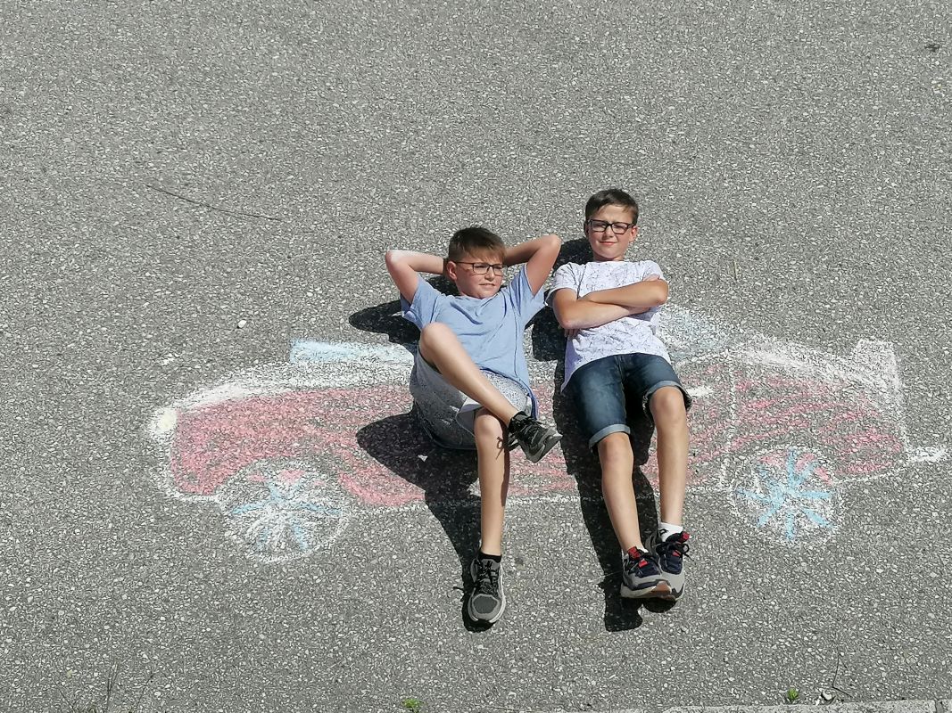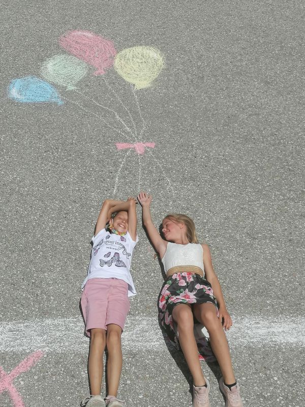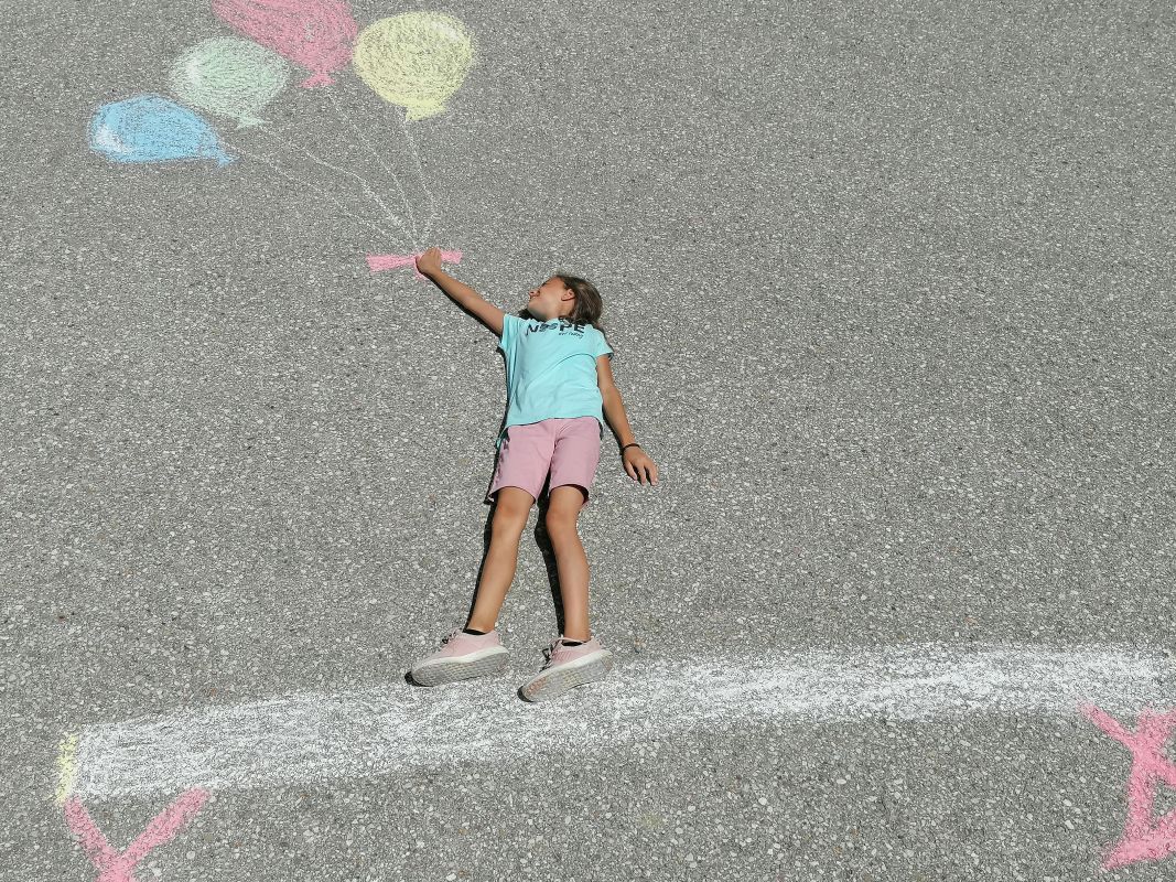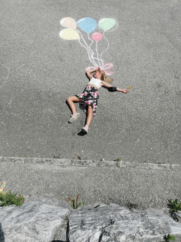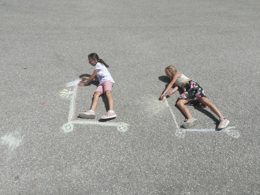 Mit Straßenkreide „bewaffnet“ ging es bei 30 Grad hinaus ins Freie. Frisch ans Werk brachte die 1b wahrlich erstaunliche Kunstwerke auf die Straße. Richtig positioniert hoben die Kinder ab, mittels Luftballons und Supermancape.
