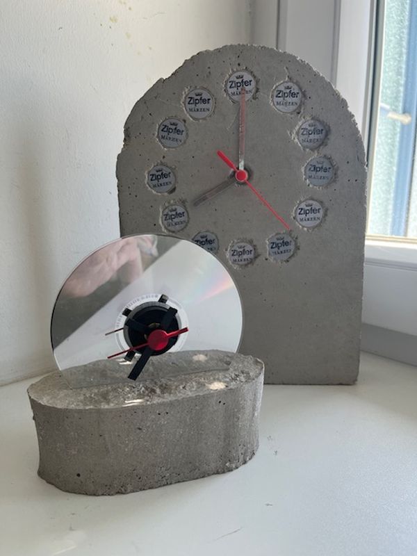 In WPG-Technischen Werken stellten Schüler als letztes Werkstück Standuhren aus Beton her. Nach eigenen Entwürfen wurden Formen gebaut, gegossen und montiert.
